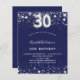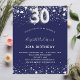 A modern, stylish and glamorous invitation for a 30th birthday party. A navy blue background, decorated with faux silver stars. Personalize and add your name and party details. Number 30 is written with a balloon style font.