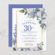 Honor a special woman with this elegant and feminine Budget 30th Birthday Surprise Party invitation. Surprise and 30th are written in large blue text. Birthday Celebration follows. The honored guest's name is also in blue capital letters. The birthday celebration details are surrounded by a chic gold frame. The blue flowers and white roses are nestled in deep green leaves.