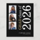 A value for money BUDGET alternative on a smaller size 4.5 x 5.6” semi-gloss 110lbs weight, which is of similar thickness to a postcard (however is not suitable to use as a postcard.). PLEASE NOTE there is ONE invite per sheet. Budget 3 photo 2026 Black Graduation Announcement. A modern stylish typography and multi photo design, with large text rotated and to the right hand side in white and gold on a background of black. Easily personalise the rest of the text and replace the photos in the templates with your own of square orientation.