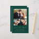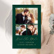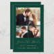 This simple, minimalist Save the Date card features a 3-photo collage, with a horizontal photo at the top and two square photos below. The words "Save the Date" appear in elegant gold-colored handwriting script, followed by the couple's names, wedding date and city in sans serif font on an emerald green background. Add a more detailed message with additional information on the back.