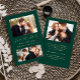 This simple, minimalist Save the Date card features a photo collage, with a horizontal photo at the top and two square photos below. Between the top and bottom photos, the words "Save the Date" appear in elegant gold-colored handwriting script, followed by the couple's names, wedding date and city in sans serif font on an emerald green background. Add a fourth, horizontal photo and a more detailed message with additional information on the back.
