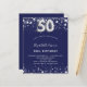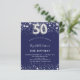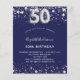 A modern, stylish and glamorous invitation for a 50th birthday party. A navy blue background, decorated with faux silver stars. Personalize and add your name and party details. Number 50 is written with a balloon style font.