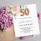 An elegant invitation for a 50th birthday party. A chic white background. Decorated with a rose gold and blush pink watercolored rose flower, floral, green eucalyptus leaves, sprigs, greenery and faux gold sprigs. Personalize and the name and party details. Black and golden letters. The name is written with a modern hand lettered style script. Number 50 is written with a golden balloon style font.