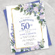Honor a special woman with this elegant and feminine Budget 50th Birthday Surprise Party invitation. Surprise and 50th are written in large blue text. Birthday Celebration follows. The honored guest's name is also in blue capital letters. The birthday celebration details are surrounded by a chic gold frame. The blue flowers and white roses are nestled in deep green leaves.