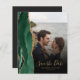 The left-hand edge of this elegant modern wedding save the date card features an emerald green watercolor agate border trimmed with faux gold glitter. The customizable text overlay combines gold-colored handwriting script and copperplate fonts over a photo of your choice. A black gradient filter helps make the text pop. The back provides spaces for four additional photos (one square, two horizontal and one vertical), along with room for your wedding website URL or other brief message in gold-colored text on an off-black background.