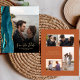 The left-hand edge of this elegant modern wedding save the date card features a teal blue watercolor agate border trimmed with faux gold glitter. The customizable text overlay combines gold-colored handwriting script and copperplate fonts over a photo of your choice. A black gradient filter helps make the text pop. The back provides spaces for four additional photos (one square, two horizontal and one vertical), along with room for your wedding website URL or other brief message in gold-colored text on a burnt orange or rust background.