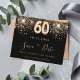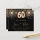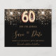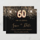 A girly and trendy Save the Date for a 60th birthday party. A black background decorated with faux gold glitter. Templates for a date and name and text. Golden colored letters. The text: Save the Date is written with a large trendy hand lettered style script.
