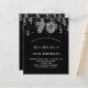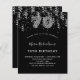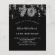 A modern, stylish and glamorous invitation for a 70th birthday party. A black background, decorated with silver confetti. The name is written with a modern hand lettered style script. Personalize and add your party details. Number 70 is written with a trendy balloon style font, leopard pattern.