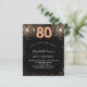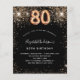 A modern, stylish and glamorous invitation for a 80th birthday party. A black background decorated with faux glitter. The name is written with a modern golden colored hand lettered style script. Personalize and add your party details. Number 80 is written with a balloon style font, script.