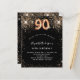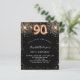 A modern, stylish and glamorous invitation for a 90th birthday party. A black background decorated with faux glitter. The name is written with a modern golden colored hand lettered style script. Personalize and add your party details. Number 90 is written with a balloon style font, script.