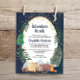 Budget-friendly rustic baby shower by mail invitation featuring a cute illustration of woodland animals with their tent camping in the mountains and forest, an overlay of gold stars and moon in a nighttime sky and "Adventure Awaits" and the mother-to-be's name in a dark midnight blue script. Easily personalize the shower by mail details.