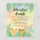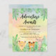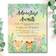 It features a hand-drawn watercolor of lion, giraffe, and tiger cubs with green palm leaves and says "Adventure Awaits!" in rustic typography with a colorful background.