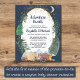 Budget-friendly rustic baby shower invitation featuring a cute illustration of woodland animals with their tent camping in the mountains and forest, an overlay of gold stars and moon in a nighttime sky and "Adventure Awaits" and the mother-to-be's name in a dark midnight blue script. Easily personalize the shower details.