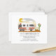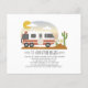 Adventure themed neutral unisex baby shower with illustration of yellow and vintage motorhome rv with baby clothes hanging on clothesline connected to cactus a desert sunrise sky with sun and clouds. text says "the adventure begins"
