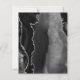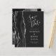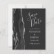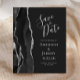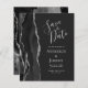 The left-hand edge of this elegant modern wedding save the date card features a black watercolor agate border trimmed with faux silver glitter. The customizable text combines silver gray handwriting, copperplate and italic fonts on an off-black background. The reverse side features a matching black and silver agate design.