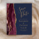 The left-hand edge of this elegant modern wedding save the date card features a burgundy watercolor agate border trimmed with faux gold glitter. The customizable text combines gold colored handwriting, copperplate and italic fonts on a navy blue background. The reverse side features a matching burgundy and gold agate design.