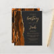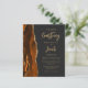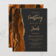 The left-hand edge of this elegant modern wedding invitation features a burnt orange watercolor agate border trimmed with faux gold glitter. The customizable text combines gold-colored script, copperplate and italic fonts on a dark off-black background. The reverse side features a matching burnt orange and gold agate design.