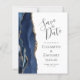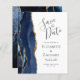The left-hand edge of this elegant modern wedding save the date card features a navy blue watercolor agate border trimmed with faux gold glitter. The customizable text combines charcoal gray handwriting, copperplate and italic fonts on a white background. The reverse side features a matching navy blue and gold agate design.
