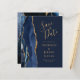 The left-hand edge of this elegant modern wedding save the date card features a navy blue watercolor agate border trimmed with faux gold glitter. The customizable text combines gold-colored handwriting, copperplate and italic fonts on a navy blue background. The reverse side features a matching navy blue and gold agate design.