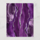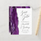 The left-hand edge of this elegant modern wedding save the date card features a purple watercolor agate border trimmed with faux silver glitter. The customizable text combines charcoal gray handwriting, copperplate and italic fonts on a white background. The reverse side features a matching purple and silver agate design.