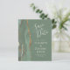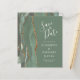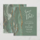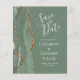 The left-hand edge of this elegant modern wedding save the date card features a sage green watercolor agate border trimmed with faux gold glitter. The customizable text combines ivory handwriting, copperplate and italic fonts on a sage green background. The reverse side features a matching sage green and gold agate design.