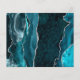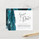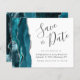 This elegant budget save the date card features a teal blue watercolor agate border trimmed with faux silver glitter. The customizable text combines charcoal gray handwriting script, copperplate and italic fonts on a white background. The reverse side features a matching teal and silver agate design.