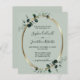 Budget All in One Eucalyptus Gold Metallic Sage Wedding Invitation... Our budget "All in One" luxe botanical wedding invitation features a gold metallic oval frame embellished with emerald-hued eucalyptus leaves over a light sage green background. The light sage back of the card contains all of the details you would typically see on separate cards in the wedding packet. This modern style wedding invitation was designed to be both elegant and budget conscious... not to mention time-saving. On the back there is also a QR code graphic template you can replace with your own code (or delete if you don't plan to use one). All example text can be easily revised with your own information on the personalization template. PLEASE NOTE: "Budget" card paper is not the same as the traditional flat card invitations. Our budget cards are 4.5 x 5.6 inches made of semi-gloss 110 lb paper compared to traditional wedding invitation flat cards at 5 x 7 inches in matte paper at 120 lb weight. Also, the budget cards do not automatically come with envelopes, as do the traditional invitation cards, but you can purchase them on the same page at checkout if you wish. This all in one design is also available on a traditional 5x7 wedding invitation card.