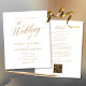 Budget All in One Elegant Calligraphy Gold and White Wedding Invitation with Details on Back... Our unique affordable "All in One" gold and white wedding invitation features elegant gold handwriting calligraphy combined with serif text for a classic and elegant wedding invitation. The back of the invitation contains all of the details you would typically see on separate cards in the wedding packet, including reception time and venue, accommodation options, wedding website, RSVP and gift registry information. This modern style wedding invitation was designed to be both elegant and budget conscious... not to mention time-saving for busy brides-to-be. On the back there is also a QR code graphic template you can replace with your own code right on the personalization template... just by typing your wedding website URL All example text (aside from the graphic calligraphy elements) can be easily revised with your own information on the same personalization template.