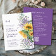 Budget All in One Watercolor Sunflower and Lavender Monogram Wedding Invitation Flyer... Sunflower symbolism: happiness, joy, enduring love. Lavender flower symbolism: love and devotion, calmness. Our "All in One" budget flyer paper floral wedding invitation features a beautiful bouquet of watercolor sunflowers and lavender setting off the bride and groom's monogram initials and the invitation text beside it. The dark lavender back of the invitation contains all of the details you would typically see on separate cards within the wedding packet. This modern style double-sided wedding invitation was designed to be both elegant and budget conscious... not to mention time-saving. On the back there is also a QR code graphic you can replace with your own code by typing your wedding website URL on the personalization template. All example text can be easily revised with your own information on the same template. **PLEASE NOTE: "Flyer" budget paper is not the same as the traditional flat card invitations or even our 110 lb budget invitations. The flyer option is the least expensive of our invites, with 80 lb paper (similar to leaflet paper) compared to traditional wedding invitation flat cards at 5 x 7 inches in matte paper at 120 lb weight. Also, the budget invitations do not automatically come with envelopes, as do the traditional invitation cards, but you can purchase them on the same page at checkout if you wish.