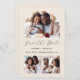 This simple, minimalist Save the Date card features an arch-shaped photo at the top and two square photos at the bottom. In between, the words "Save the Date" appear in elegant black handwriting script, followed by the couple's names, wedding date and city in sans serif font on a beige background. Add a more detailed message with additional information on the back, along with a QR code to help your guests visit your wedding website.