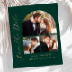 This simple, minimalist Save the Date card features a photo collage arch, with a horizontal photo at the top and two square photos below. The words "Save the Date" run vertically up the left margin in elegant gold-colored handwriting script. The couple's names, wedding date and city appear below the photo collage in sans serif font on an emerald green background. Add a more detailed message with additional information on the back.