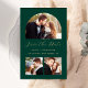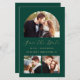 This simple, minimalist Save the Date card features a photo collage arch, with a horizontal photo at the top and two square photos below. Between the top and bottom photos, the words "Save the Date" appear in elegant gold-colored handwriting script, followed by the couple's names, wedding date and city in sans serif font on an emerald green background. Add a more detailed message with additional information on the back.