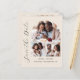 This simple, minimalist Save the Date card features a photo collage arch, with a horizontal photo at the top and two square photos below. The words "Save the Date" run vertically up the left margin in elegant black handwriting script. The couple's names, wedding date and city appear below the photo collage in sans serif font on a beige background. Add a fourth, horizontal photo and amore detailed message with additional information on the back.