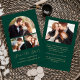 This simple, minimalist Save the Date card features a photo collage arch, with a horizontal photo at the top and two square photos below. The words "Save the Date" appear in elegant gold-colored handwriting script, followed by the couple's names, wedding date and city in sans serif font on an emerald green background. Add a fourth, horizontal photo to the back, along with a more detailed message with additional information.