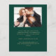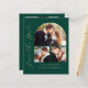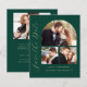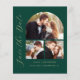 This simple, minimalist Save the Date card features a photo collage arch, with a horizontal photo at the top and two square photos below. The words "Save the Date" run vertically up the left margin in elegant gold-colored handwriting script. The couple's names, wedding date and city appear below the photo collage in sans serif font on an emerald green background. Add a fourth, horizontal photo and amore detailed message with additional information on the back.
