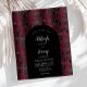 This elegant design features a moody background image of vintage faux velvet floral damask pattern in burgundy and black. Personalize it with the names of the bride and groom in silver gray calligraphy script and the remaining text in a combination of sans serif, copperplate and italics on a black arch shape. A matching damask pattern appears on the reverse side.