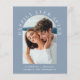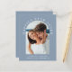 Modern budget-friendly all-in-one dusty blue wedding invitation featuring your photo in an arch and "Happily Ever After" in elegant white typography. Add your first names, wedding date and location. On the reverse side, personalize your invitation in simple white typography and input your wedding website address to create a scannable QR code for your guests to scan to RSVP online and obtain additional wedding details such as accommodations.