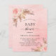 For a modern boho style baby shower. A watercolored, gradient blush pink background with faux gold sparkles. Decorated with rose gold and pink florals, roses and pampas grass. Personalize and add a name and party details.