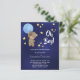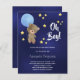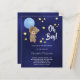 For a baby shower celebrating a baby boy. A navy blue background, and yellow stars. The blue color is uneven. A teddy bear holding a light blue balloon. Personalize and add the name of the mom to-be and party details. The text: Oh Boy! is written with a hand lettered style script