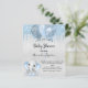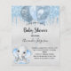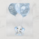For a baby shower, celebrating a baby boy. A faux silver metallic looking background. Decorated with blue faux glitter drips, paint dripping look, balloons and a cute little baby elephant boy. Personalize and add the name of the mom to-be's name and party details. The name and the text: Baby Shower are written with a hand lettered style script