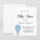 For a baby shower, celebrating a baby girl. A white background, and a cute little baby elephant boy in a blue hot air balloon. Personalize and add the name of the mom to-be's name and party details. The name and the text: Baby Shower are written with a hand lettered style script