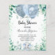 For a baby shower, celebrating a baby boy. A white background. Decorated with blue balloons, a cute little baby elephant boy and eucalyptus greenery and green sparkles. Personalize and add the name of the mom to-be's name and party details. The name and the text: Baby Shower are written with a hand lettered style script