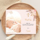A modern and elegant baptism thank you card. A blush background decorated with blush florals and pampas grass. Personalize and add your photo of the child inside the arch frame, thank you note and name.