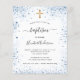 A modern, elegant baptism, celebrating a baby boy. White background decorated with blue faux glitter dust and a golden cross. Personalize and add a name and party details. Black colored letters.