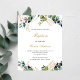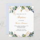 A white background decorated with eucalyptus greenery and golden leaves. Personalize and the child's name and ceremony details. Black and golden colored letters.