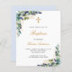 A white background decorated with eucalyptus greenery and golden leaves and a golden cross. Personalize and the childs name and ceremony details. Black and golden colored letters.
