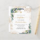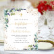 A white background decorated with eucalyptus greenery and golden leaves and faux gold glitter dust. Personalize and the childs name and ceremony details. Black and golden colored letters.