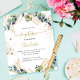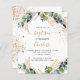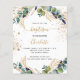 A white background decorated with eucalyptus greenery and golden leaves and faux gold glitter drops. Personalize and the childs name and ceremony details. Black and golden colored letters.