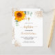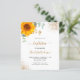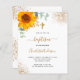 A white background decorated with a watercolored sunflower, eucalyptus greenery and golden leaves and faux gold glitter drops. Personalize and the childs name and ceremony details. Black and golden colored letters. Gender neutral.
