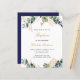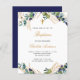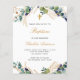 A white background decorated with eucalyptus greenery and golden leaves. Personalize and the child's name and ceremony details. Black and golden colored letters.